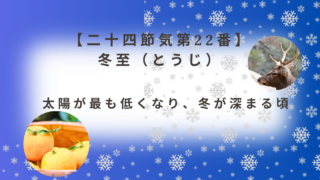 二十四節季 【二十四節気第22番】冬至(とうじ)|太陽が最も低くなり、冬が深まる頃 冬至は一年で最も昼が短い節気。意味や由来、三候の自然、かぼちゃやゆずを使った冬至の食と、子育て家庭でも無理なくできる季節の整え方を紹介。 2025.12.26 二十四節季健康薬膳食生活