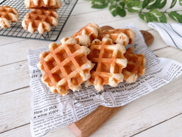 - 生地をワッフルメーカーで挟み、中弱火で両面2分ずつ焼いて完成です。